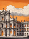 Capture the drama of a majestic Baroque facade rendered in a dynamic, graphic style. The stark white architecture contrasts brilliantly with the deep burnt orange sky, creating a vivid focal point. This piece brings old-world grandeur and striking color to any modern living room or sophisticated office space.