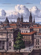 This vivid artwork captures a classic European cityscape with warm terracotta and sepia tones beneath a sweeping, dramatic sky. Its detailed, illustrative style evokes a sense of romantic, old-world charm and sophistication. It's a striking piece that adds depth, warmth, and a focal point to any living room or office decor.