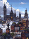 Capture the dramatic charm of a classic city in this vibrant, comic-style illustration. Rich, warm window lights contrast with the cool twilight sky and dark spires, creating an intense, nostalgic mood. Perfect for adding a unique, sophisticated focal point to your living room or office decor.