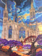 A majestic Gothic cathedral bathed in the glow of a twilight sky. Rich blues, deep purples, and fiery golds create a dreamlike, fantasy atmosphere. The vibrant, contrasting colors and stylized detail bring a striking modern elegance to any living room, office, or bedroom.