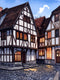 This evocative piece captures the warm glow of a cobbled European street at dusk. The half-timbered style and rich, earthy tones of the roofs contrast beautifully with the bright, inviting light spilling from the windows. Perfect for adding a classic, cozy charm to your living room or study.