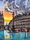 Immerse yourself in the romantic allure of a Parisian evening. This vibrant artwork captures a captivating city scene bathed in the warm glow of sunset, contrasted with dramatic, stylized clouds. The rich blues and oranges create a serene yet dynamic mood, perfect for adding a touch of sophisticated charm to any living room, bedroom, or office space.