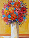 "Brighten your space with this captivating impasto artwork. 'Vibrant Daisy Dance' features a lively bouquet bursting with warm reds, oranges, and cheerful blues against a textured golden background. Its modern, expressive style brings an energetic yet elegant focal point to living rooms, bedrooms, or offices, creating an uplifting and inviting atmosphere."