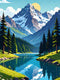 This captivating artwork showcases a harmonious blend of majestic snow-capped mountains and tranquil, reflective waters. Its vibrant blues and greens, accented by the golden sun, create a serene and refreshing mood. Perfect for adding a touch of nature's grandeur and a calming modern aesthetic to living rooms, bedrooms, or office spaces.