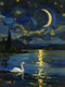A captivating canvas blending a Starry Night style with the tranquil beauty of a swan on a moonlit lake. Deep blues and swirling golds create a dreamy, serene mood. This Expressionist piece adds a touch of vibrant elegance and artistic sophistication to any living room, bedroom, or office space.