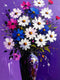 An expressive, modern abstract floral painting featuring thick, impasto texture and vibrant tones of white, electric blue, and magenta set against a dramatic violet background. This striking piece adds a pop of luxurious color and artistic energy, perfect for transforming any living room, bedroom, or office.