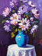 This captivating impasto artwork features a striking bouquet of lilac and white blossoms, beautifully contrasted by a vibrant azure vase. The rich, textured brushstrokes create a sense of depth and energy, while the interplay of cool purples and blues evokes a serene yet lively mood. Perfect for adding a touch of modern elegance and a pop of color to any living room, bedroom, or office space.