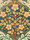 This embroidered textile features a vibrant, symmetrical floral design in the Arts and Crafts style. Its rich blues, earthy greens, and warm peach tones create a serene and elegant mood. The intricate botanical motif adds a touch of classic sophistication, making it a beautiful and calming accent for any living room or bedroom.
