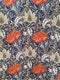 This ornate wallpaper features a rich, dark blue background adorned with stylized, intertwined floral and leafy motifs in warm oranges, soft creams, and earthy browns. Its intricate pattern creates a timeless, luxurious, and cozy ambiance, perfect for a sophisticated accent wall in a living room, bedroom, or study.