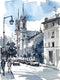 This charming artwork captures a serene city street scene with a grand cathedral, rendered in a captivating watercolor and ink style. Soft blue and grey tones evoke a peaceful, timeless mood, while the detailed lines add a touch of modern elegance. Perfect for enhancing living rooms, bedrooms, or offices with a sophisticated, calming presence.