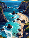This captivating artwork portrays a serene coastal inlet, its vibrant azure and turquoise waters gently lapping against a golden sandy shore. The bold lines and rich color tones evoke a sense of peaceful grandeur. Perfect for adding a calming yet striking focal point to your living room, bedroom, or office, enhancing any modern or contemporary decor.