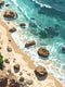 This serene artwork captures the crystal-blue shoreline with soft foamy waves and sunlit rocks, rendered in a clean, stylized aesthetic. The fresh aqua tones and gentle composition evoke calm and escape. A beautiful choice for bedrooms, bathrooms, or beach-themed interiors, it brings the ocean’s peace indoors.