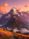 Experience the breathtaking beauty of an alpine sunset with this captivating artwork. Rich oranges and purples illuminate snow-capped peaks, creating a serene and majestic mood. This piece, with its vibrant yet calming palette, is perfect for adding a touch of grandeur and tranquility to living rooms, bedrooms, or office spaces.