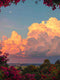 This captivating artwork frames a vibrant sunset, showcasing magnificent clouds bathed in golden and rose hues. The lush floral border adds depth and a touch of romantic elegance. Perfect for creating a serene and inviting atmosphere, this piece enhances living rooms, bedrooms, or offices with its warm, natural beauty.