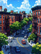 This vibrant artwork captures a bustling city street under a bright, cloud-filled sky, rendered in a charming, illustrative style. Rich terracotta buildings and lush green trees are set against a calming blue, creating a warm and inviting mood. Perfect for adding a touch of urban elegance and cheerful energy to living rooms, bedrooms, or offices.