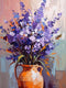 This vibrant impasto oil painting brings a joyful, modern touch to any space. Bold, thick strokes in rich purples, blues, and bright orange create an abstract bouquet set in a warm terracotta jug. Its lively texture and vivid color contrast make it a stunning, eye-catching centerpiece perfect for energizing a living room, bedroom, or office.
