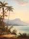 Experience the tranquil beauty of a tropical paradise at sunset. This captivating piece, with its lush foliage, towering palms, and soft pastel skies, evokes a serene, classic style. The calming blues, pinks, and greens create a peaceful ambiance, making it a perfect, elegant focal point for your living room or bedroom retreat.