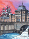 This vibrant, surreal scene captures a majestic tall ship sailing over a historic stone bridge against a dramatic, fiery sky. Its rich blend of deep blues, earthy stone, and vivid crimson adds a bold, fantastical elegance to any room. A captivating focal point for a living space or office.