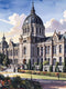 This beautiful watercolor painting captures a grand classical building bathed in soft light. Its elegant architecture and soothing neutral tones with touches of natural greenery create a sophisticated and tranquil mood. Perfect for adding a touch of timeless grace to any living room, bedroom, or office space.