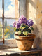 A charming digital painting capturing lavender hydrangeas bathed in soft morning light. The impressionistic style and warm, earthy tones evoke a serene, rustic garden mood. Perfect for adding a touch of peaceful elegance to a living room or creating a calm oasis in a bedroom.