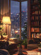 This cozy artwork captures the serenity of a rainy city evening from a book-filled, softly lit interior. With deep blues, warm ambers, and lush indoor greenery, it radiates comfort and introspection. Perfect for bedrooms, reading nooks, or offices, it brings peaceful ambiance and soulful charm to any space.